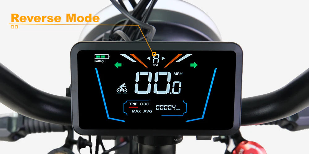 The Tour Lite E-trike boasts seven riding modes on a 5" power display to power your ride according to your need. It also includes a reverse mode, which allows you to engage reverse by holding the "-" button, and releasing it exits the mode for easy operation. This reduces physical effort when reversing with cargo and enhances maneuverability and safety.