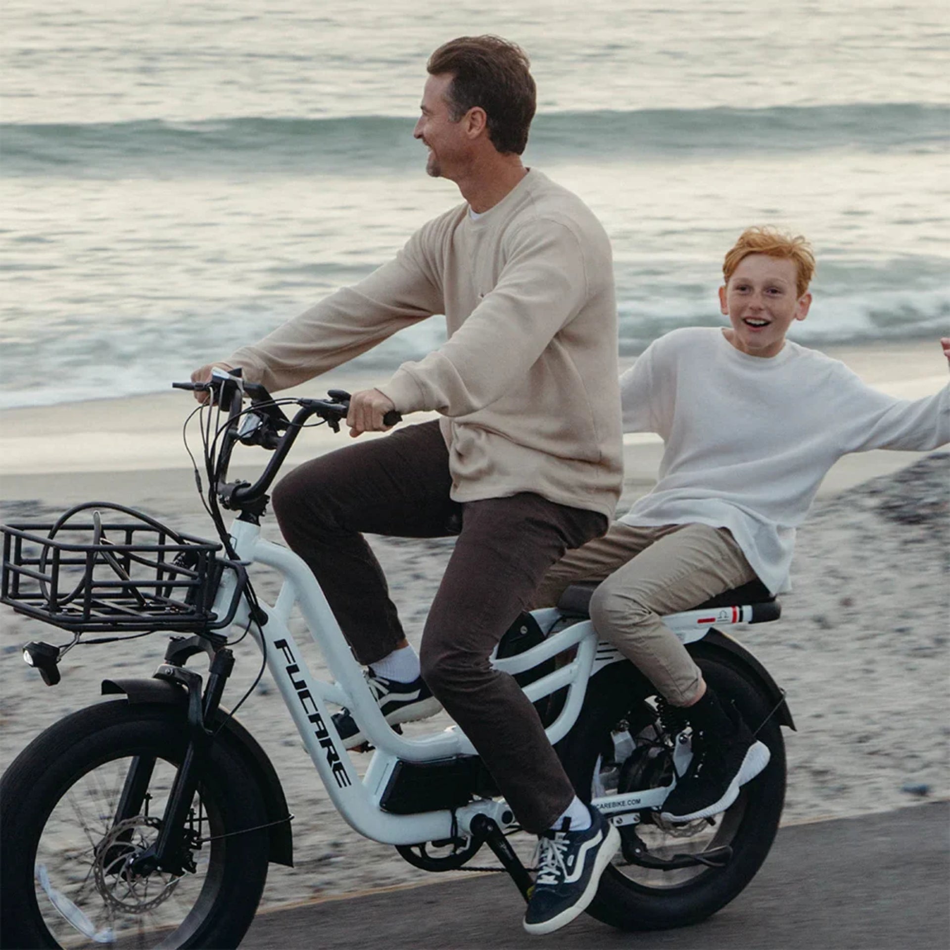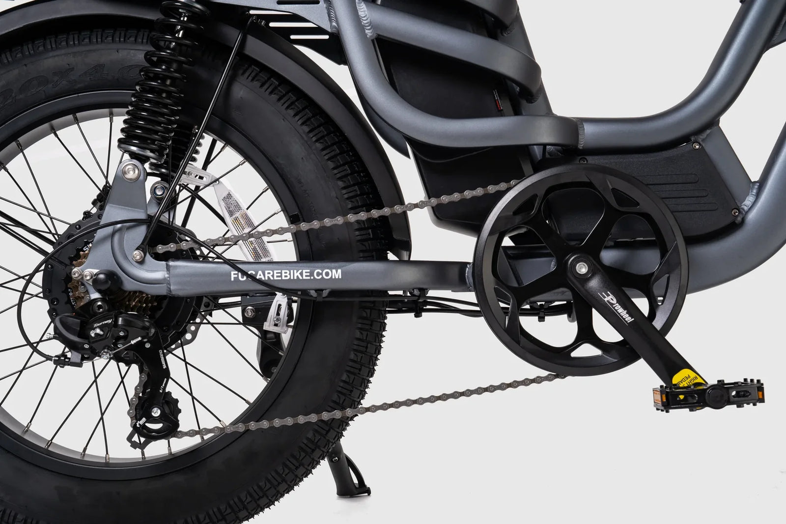 The bike's robust aluminum alloy frame, combined with its front and rear suspension, ensures a smooth and comfortable ride on any terrain. The step-through design and Fucare's unique Stability Triangle further enhance the bike's ease of use and stability making it a perfect companion for any trip.