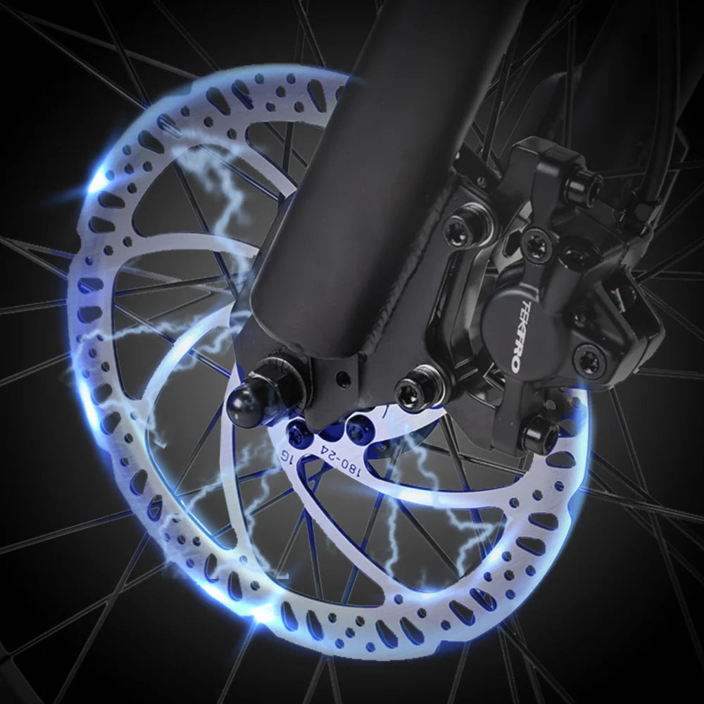 The 180mm hydraulic disc brakes provide reliable and sensitive braking performance. Whether it's a sudden obstacle or a steep descent, hydraulic brakes empower riders to exercise precise control over the speed. Whether it's a sunny day or a rainy afternoon, hydraulic brakes maintain the sensitivity and reliability.