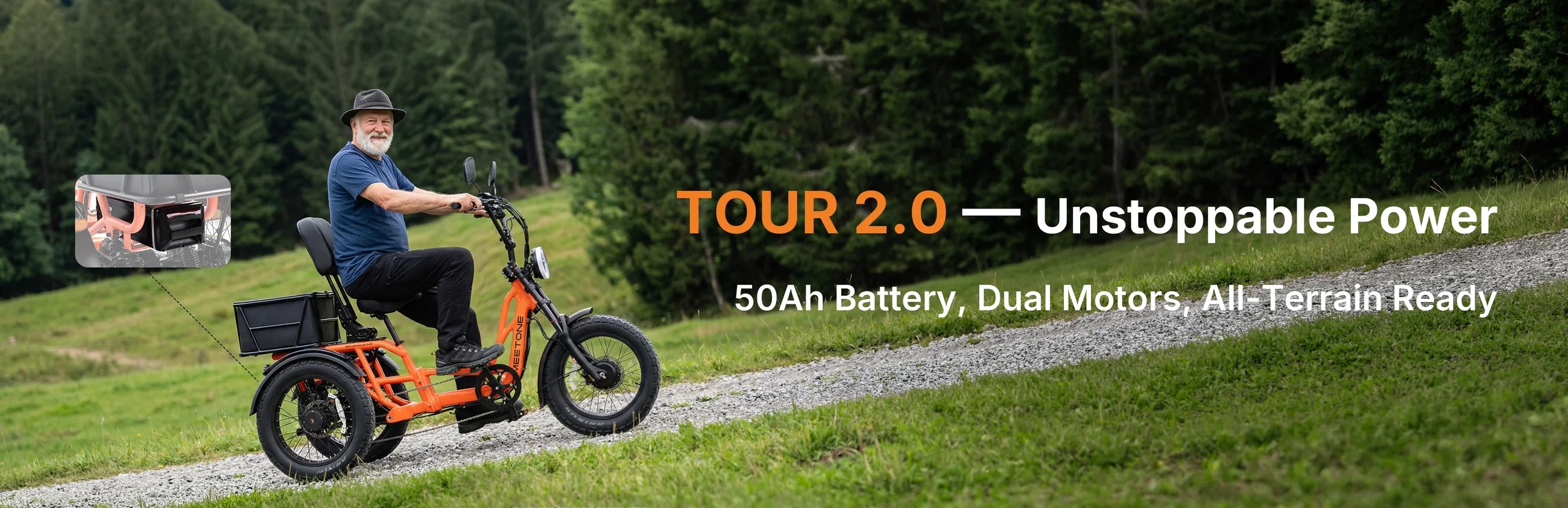 Take the best-rated semi-recumbent electric trike of 2025—and push it even further. The Meet One Tour 2.0 builds on everything riders already love, now upgraded! With dual motors, extended range, triple-suspension, expanded rear capacity and enhanced comfort to deliver a smoother, more powerful, and more capable ride than ever before.